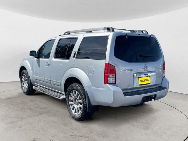 Silver Lightning 2011 Nissan Pathfinder LE 4WD 5-Speed Automatic with Manual Mode 4.0L V6 DOHC 4WD, 10 Speakers, 18" x 7.5" Bright Machined Alloy Wheels, 3.133 Axle Ratio, 3rd row seats: split-bench, 4-Wheel Disc Brakes, ABS brakes, Adjustable pedals, Air Conditioning, Alloy wheels, AM/FM radio: XM, AM/FM/In-Dash 6-CD Changer, Anti-whiplash front head restraints, Auto-dimming Rear-View mirror, Automatic temperature control, Bodyside moldings, Bumpers: body-color, CD player, Compass, Delay-off headlights, Driver door bin, Driver vanity mirror, Dual Auto A/C w/Unique HVAC display, Dual front impact airbags, Dual front side impact airbags, Electronic Stability Control, Exterior Parking Camera Rear, Floormats & Carpeted Cargo Area Mat, Four wheel independent suspension, Front anti-roll bar, Front Bucket Seats, Front Center Armrest, Front dual zone A/C, Front fog lights, Front reading lights, Garage door transmitter: HomeLink, Hard Drive Navigation System w/GPS, HDD Navigation Package, Heated door mirrors, Heated Front Bucket Seats, Heated front seats, Heated steering wheel, Illuminated entry, Leather Appointed Seat Trim, Leather Shift Knob, Low tire pressure warning, Memory seat, Moonroof Wind Deflector, Occupant sensing airbag, Outside temperature display, Overhead airbag, Overhead console, Panic alarm, Passenger door bin, Passenger vanity mirror, Pedal memory, Power door mirrors, Power driver seat, Power moonroof, Power passenger seat, Power steering, Power windows, Radio data system, Radio: Unique AM/FM Single CD Bose Faceplate, Rear air conditioning, Rear anti-roll bar, Rear reading lights, Rear seat center armrest, Rear window defroster, Rear window wiper, Remote keyless entry, Roof rack, Security system, Speed control, Speed-sensing steering, Speed-Sensitive Wipers, Split folding rear seat, Steering wheel mounted audio controls, Tachometer, Tilt steering wheel, Traction control, Trip computer, Variably intermittent wipers, Voltmeter, 4WD.Recent Arrival!