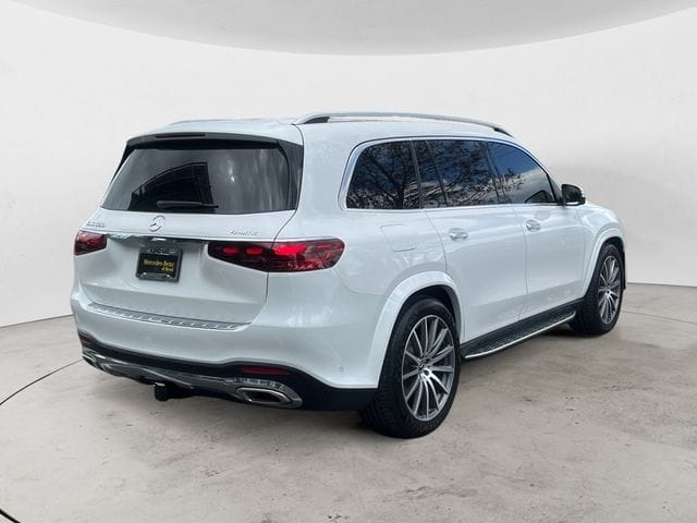 CARFAX One-Owner. Clean CARFAX. Certified. White 2025 Mercedes-Benz GLS GLS 580 4MATIC® 4MATIC® 9-Speed Automatic 4.0L V8 Mercedes-Benz Certified Pre-Owned Certified, 13 Speakers, 3rd row seats: split-bench, 4-Wheel Disc Brakes, 7-Seat Configuration, ABS brakes, Active Multicontour Power Front Seats with Massage, Adaptive suspension, Air Conditioning, Alloy wheels, AM/FM radio: SiriusXM, Apple CarPlay®/Android Auto®, Auto High-beam Headlights, Auto tilt-away steering wheel, Auto-dimming door mirrors, Auto-dimming Rear-View mirror, Auto-leveling suspension, Automatic temperature control, Brake assist, Bumpers: body-color, Child-Seat-Sensing Airbag, Compass, Delay-off headlights, Driver door bin, Driver vanity mirror, Dual front impact airbags, Dual front side impact airbags, Electronic Stability Control, Emergency communication system: eCall Emergency System, Exterior Parking Camera Rear, Four wheel independent suspension, Front anti-roll bar, Front Bucket Seats, Front Center Armrest w/Storage, Front dual zone A/C, Front reading lights, Fully automatic headlights, Garage door transmitter: HomeLink, Head restraints memory, Heated door mirrors, Heated front seats, Heated rear seats, Heated steering wheel, Illuminated entry, Illuminated running boards, Knee airbag, Leather steering wheel, Leather Upholstery, Low tire pressure warning, Memory seat, Navigation system: MB Navigation, Occupant sensing airbag, Outside temperature display, Overhead airbag, Overhead console, Panic alarm, Passenger door bin, Passenger vanity mirror, Performance Tires, Power adjustable front head restraints, Power door mirrors, Power driver seat, Power Liftgate, Power moonroof: Panorama, Power passenger seat, Power steering, Power windows, Premium audio system: MBUX, Radio: MBUX Multimedia System, Rain sensing wipers, Rear air conditioning, Rear anti-roll bar, Rear dual zone A/C, Rear fog lights, Rear reading lights, Rear seat center armrest, Rear window defroster, Rear window wi
